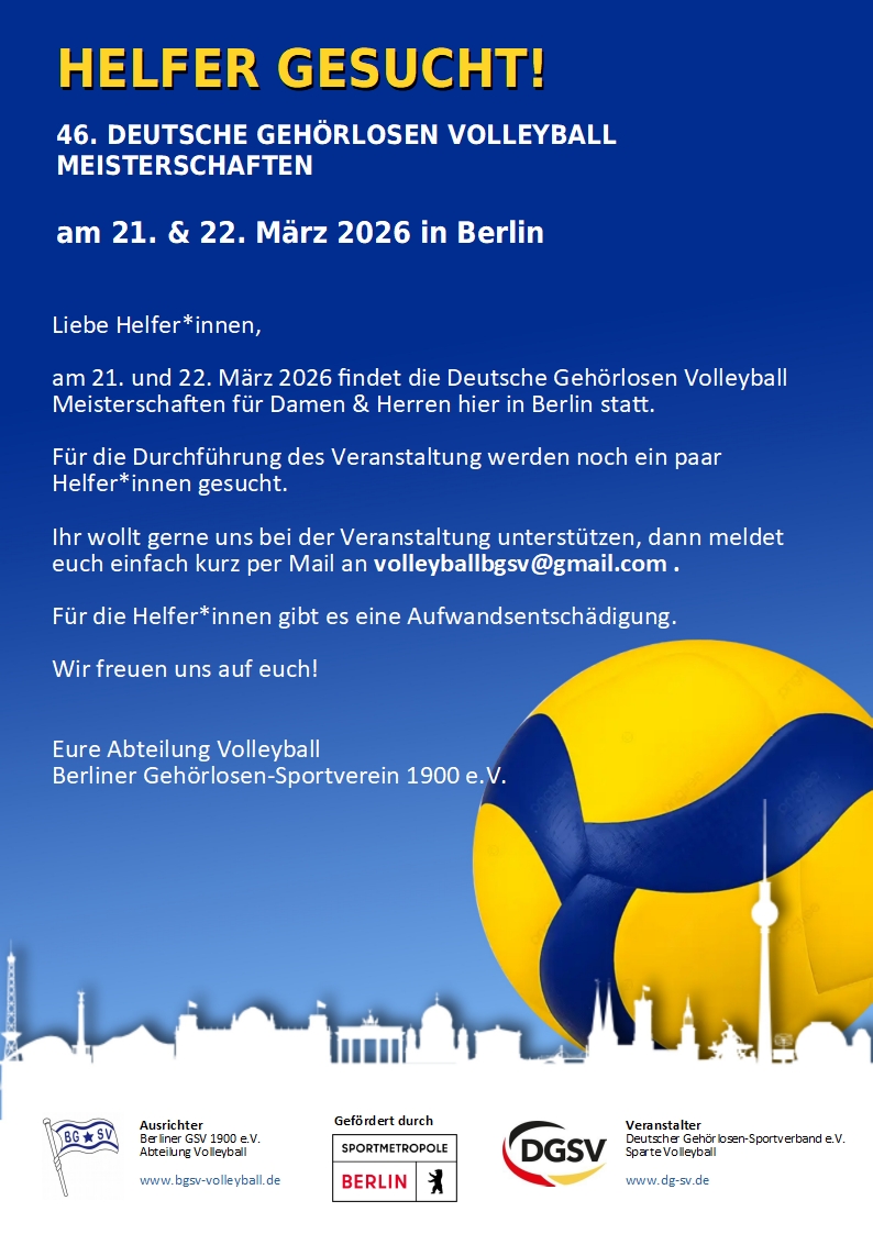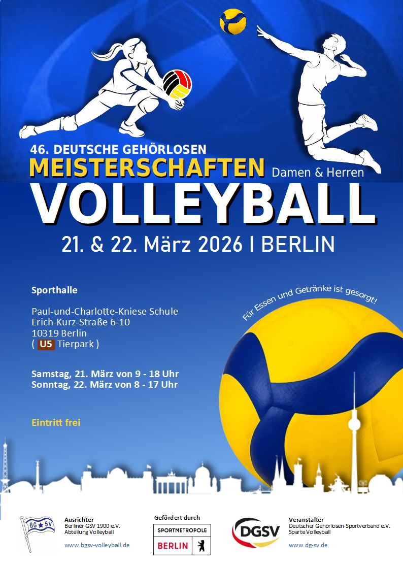Am 21. und 22. März 2026 ist es soweit: Die Abteilung Volleyball von Berliner GSV richten im Auftrag des Deutschen Gehörlosen-Sportverband der Sparte Volleyball die 46. Deutschen Gehörlosen Volleyball Meisterschaften in der Dreifachsporthalle der Kniese Schule in Berlin aus. Im Volleyball werden die Damen und Herren um die Meisterschaft kämpfen. Unsere Damen- und Herrenmannschaft von BGSV werden an den Start gehen und um den Deutschen Meistertitel angreifen.